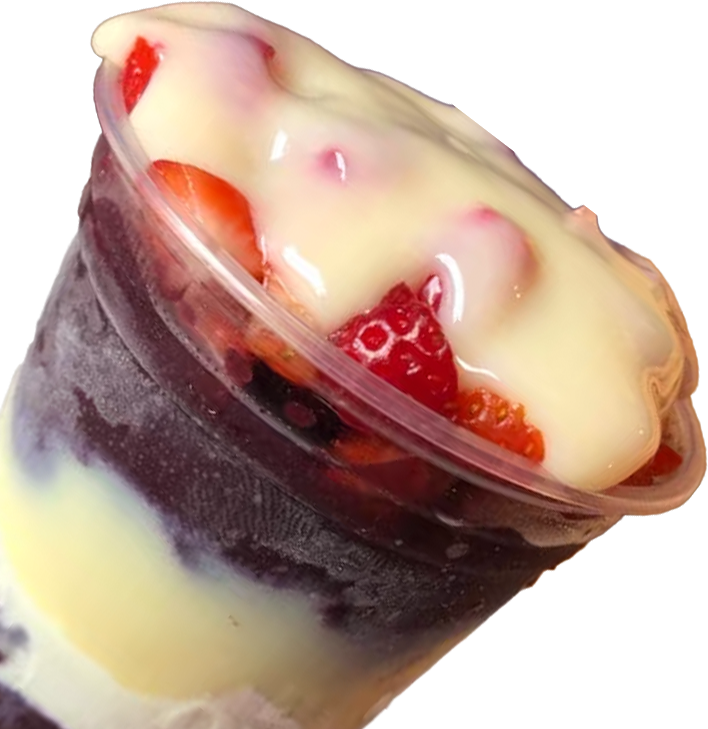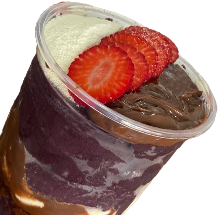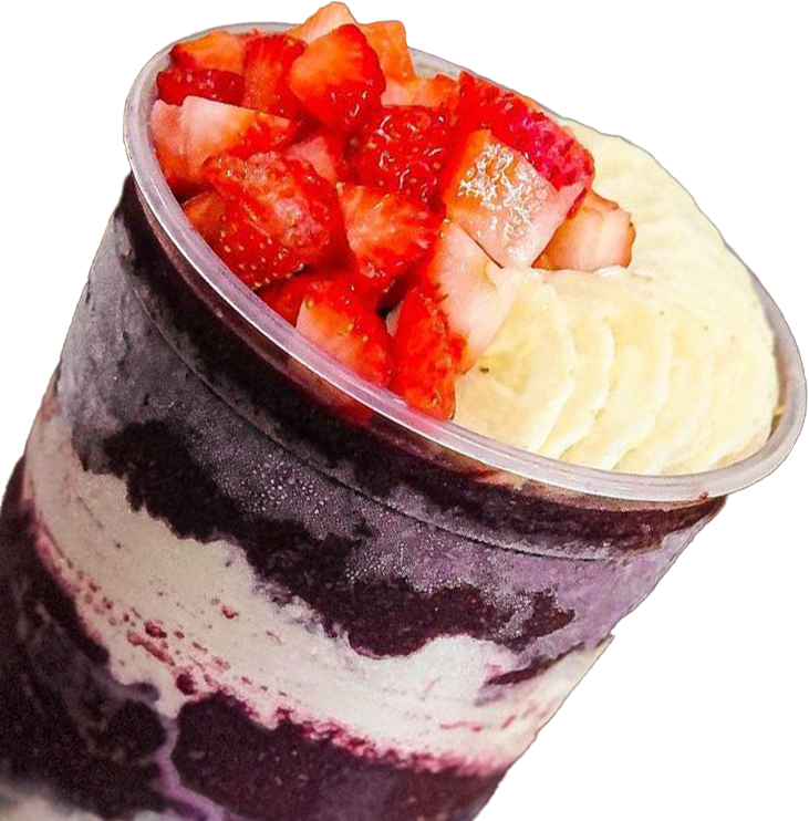 Açaí com morango, creme de Ninho, leite em pó e leite condensado.