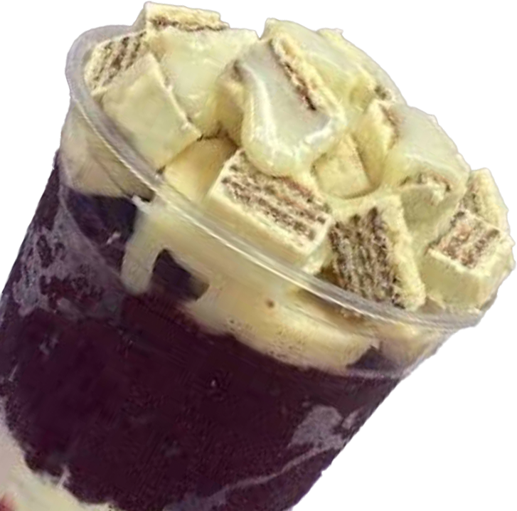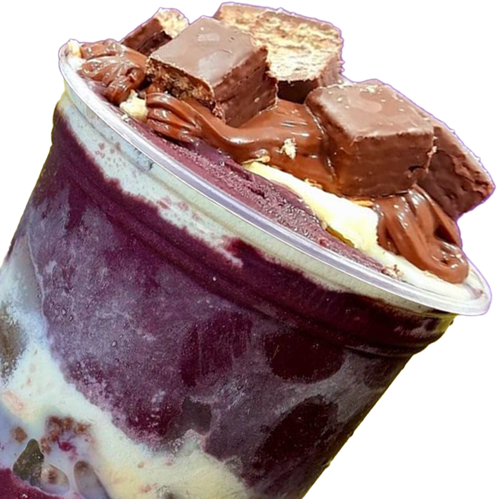 Açaí com Bis branco, creme de Ninho, leite em pó e leite condensado.